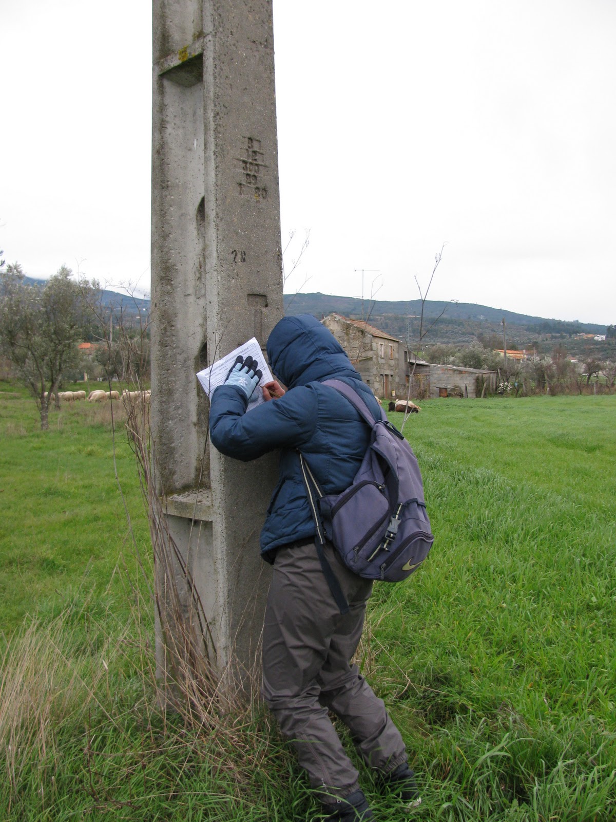 Era suposto prospectar novamente debaixo da linha, desde a margem do rio até ao apoio seguinte, mas com aquela chuva dou aquele vão como não prospectado e enfio-me dentro do poste! Sim! Era daqueles de betão, por isso, conseguia pôr-me lá dentro toda encostada, e o Tiago, nos seus 2 metros, quase encostado a mim, para se proteger da chuva, que caía batida na direcção contrária.